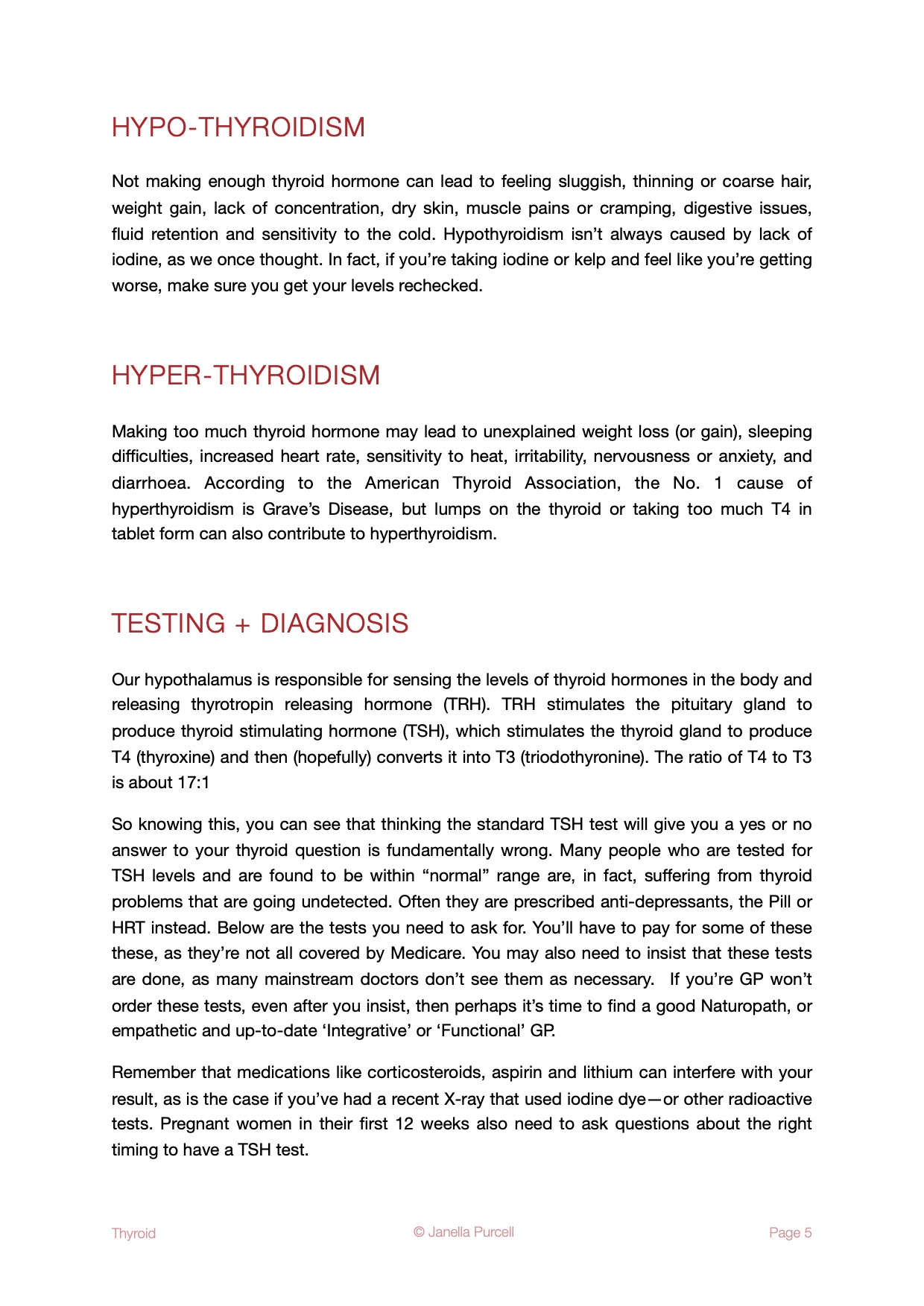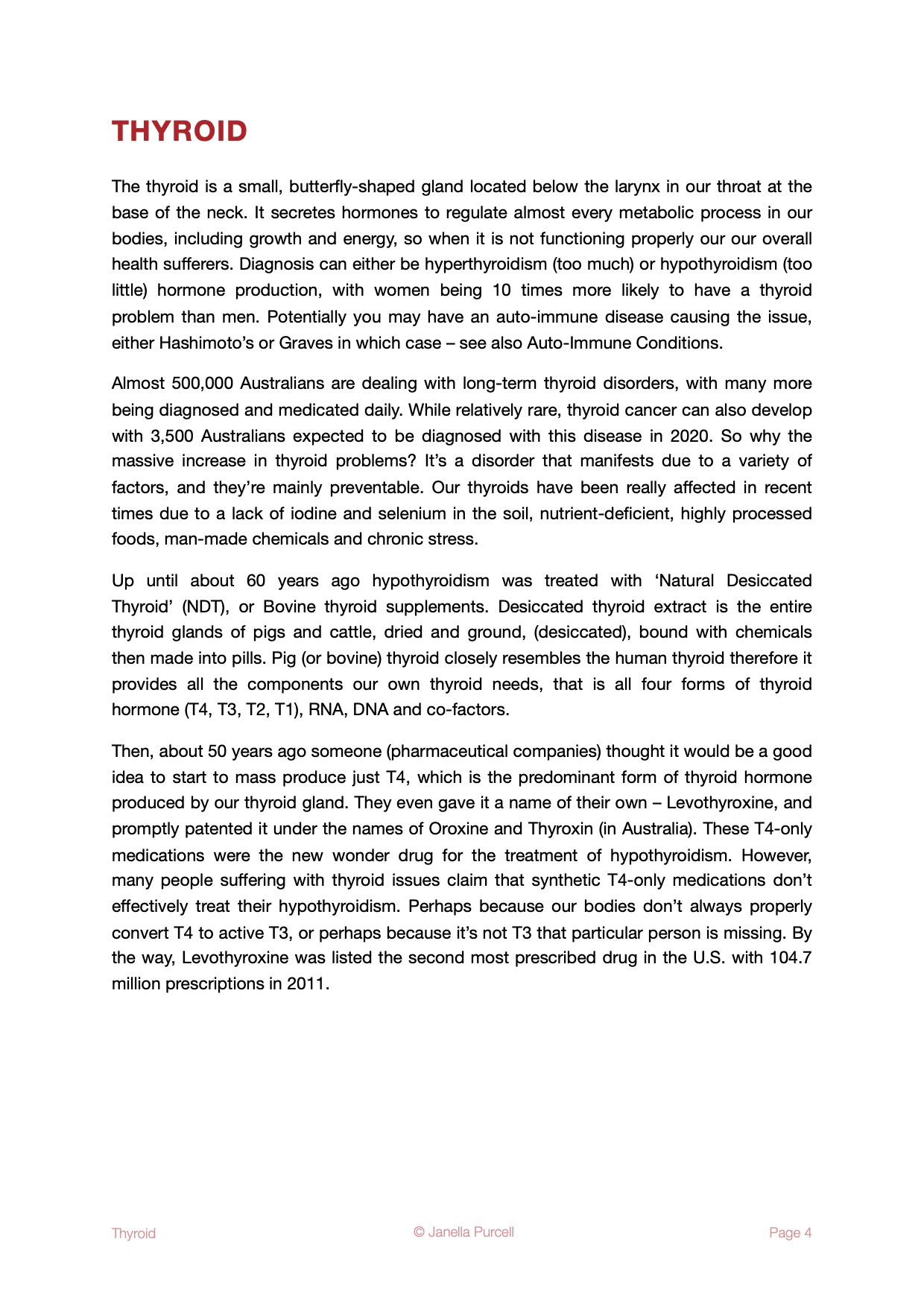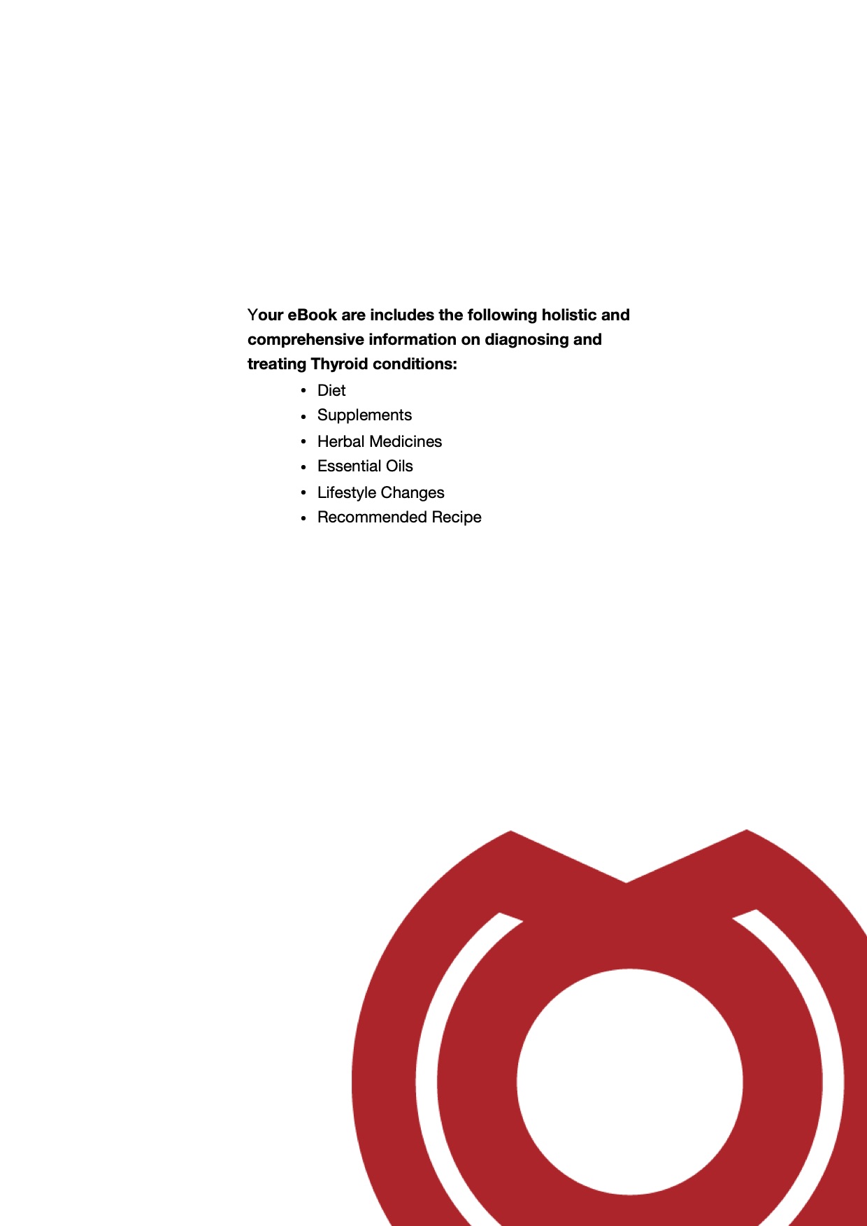 Your eBook are includes the following holistic and comprehensive information on diagnosing and treating Thyroid conditions: Diet, Supplements, Herbal Medicines, Essential Oils, Lifestyle Changes, Recommended Recipe.